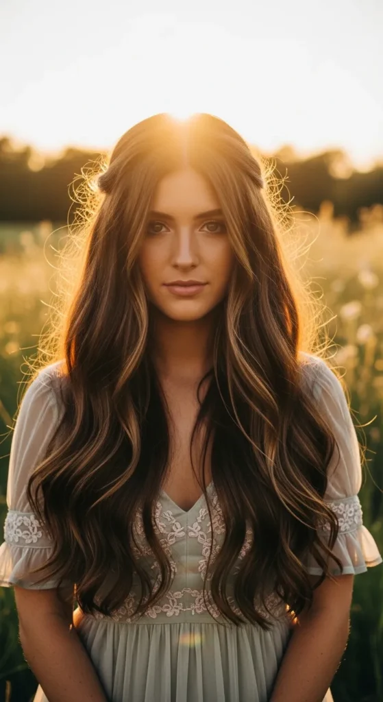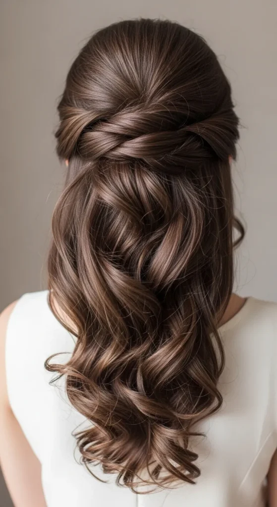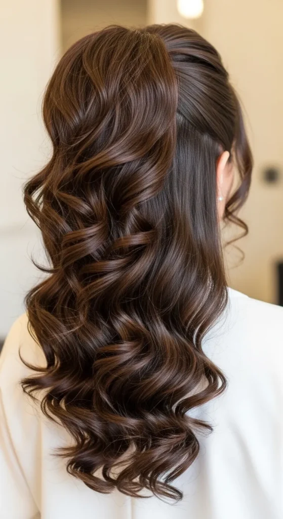 Soft curls cascading down the back create movement and romance. This style works well for long hair and highlights brunette shine without extra accessories.