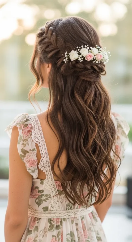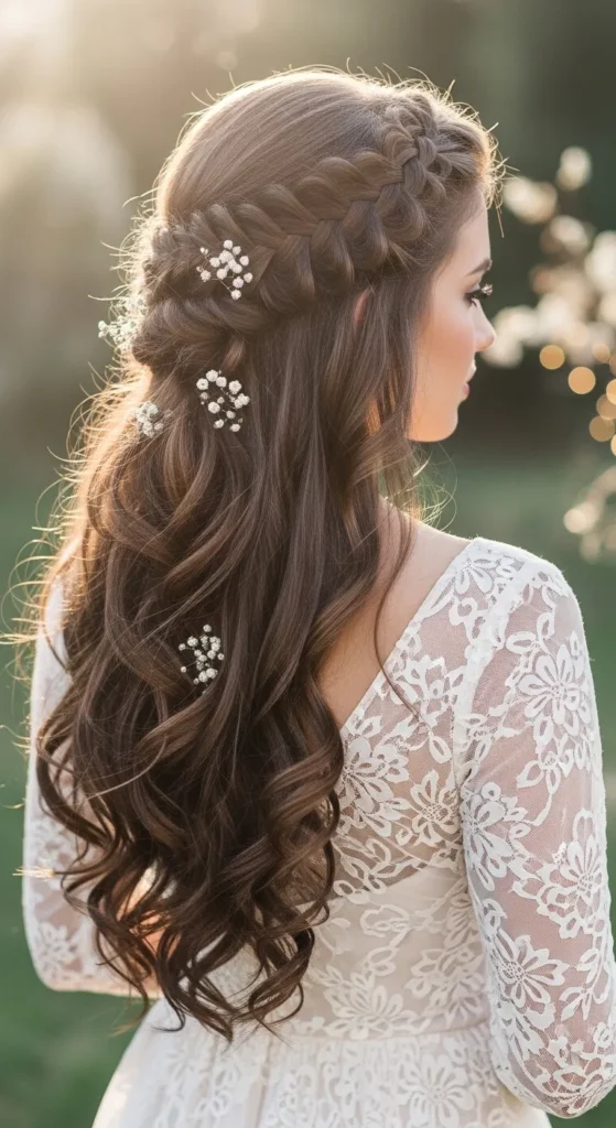 A braided crown keeps hair off your face while leaving length flowing behind. It’s flattering, comfortable, and ideal if you want a romantic, fairy-tale-inspired look.