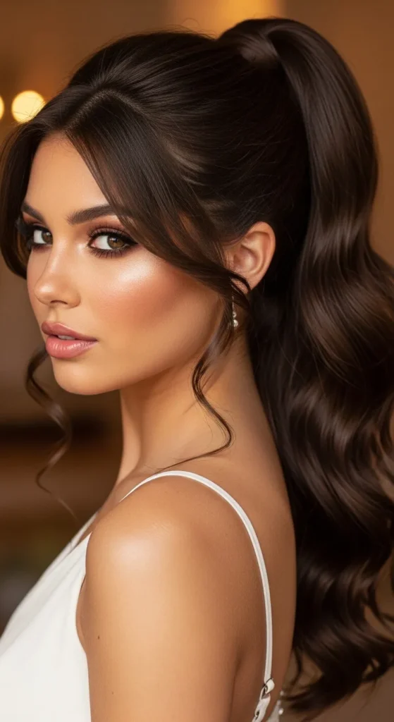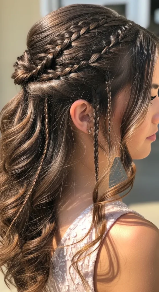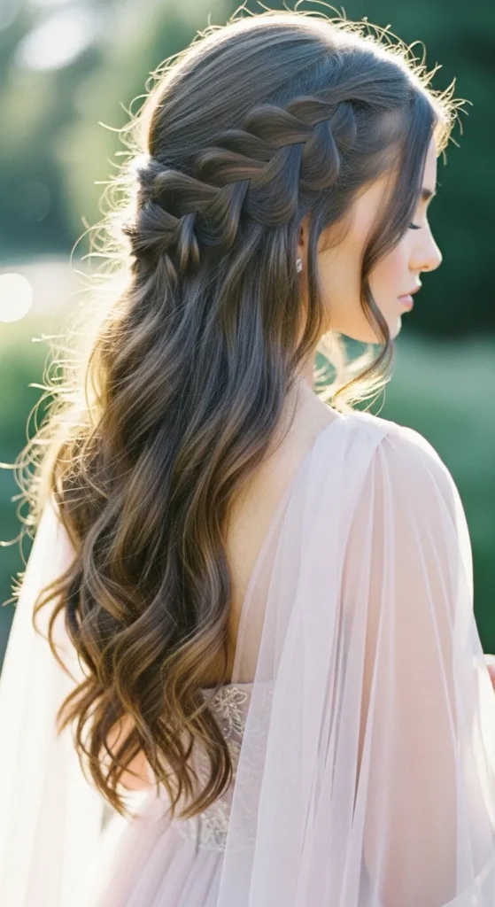 A loose side braid paired with flowing waves feels romantic and effortless. It’s ideal for one-shoulder dresses and looks amazing in photos, especially for brunettes with dimension.