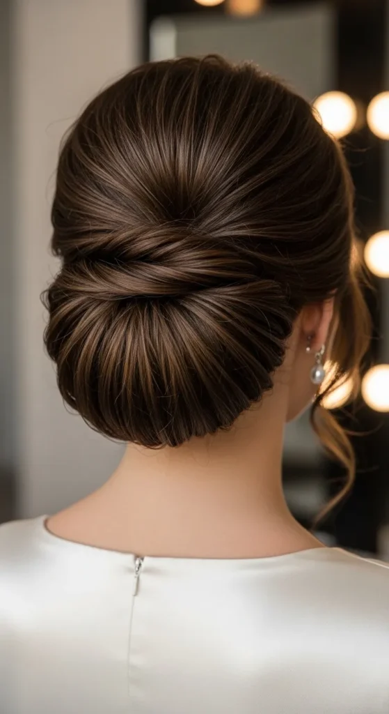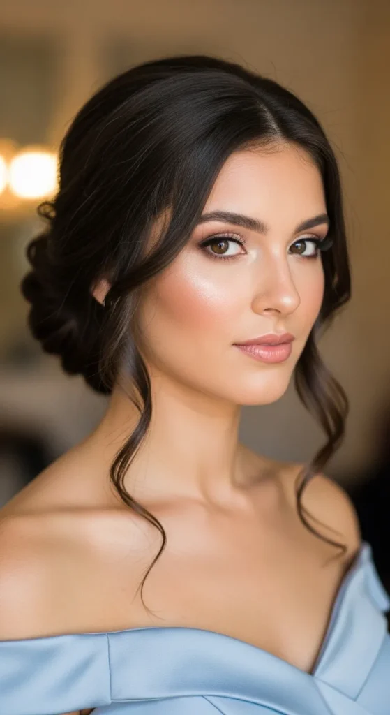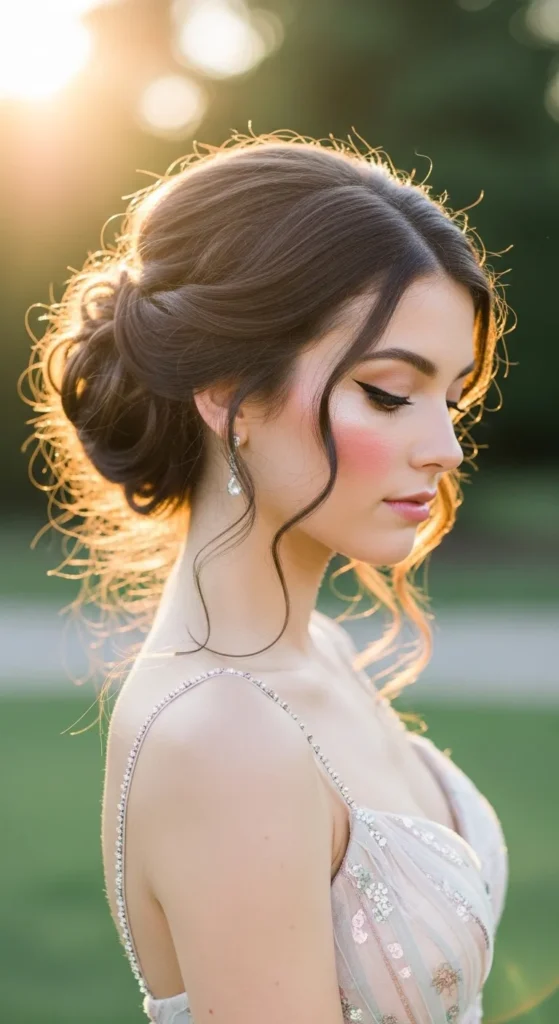 This timeless updo is perfect if you want elegance without stiffness. A low bun with loose face-framing strands softens brunette tones and works beautifully with strapless or off-shoulder dresses. Ask for light texture so it feels modern and not overly formal.