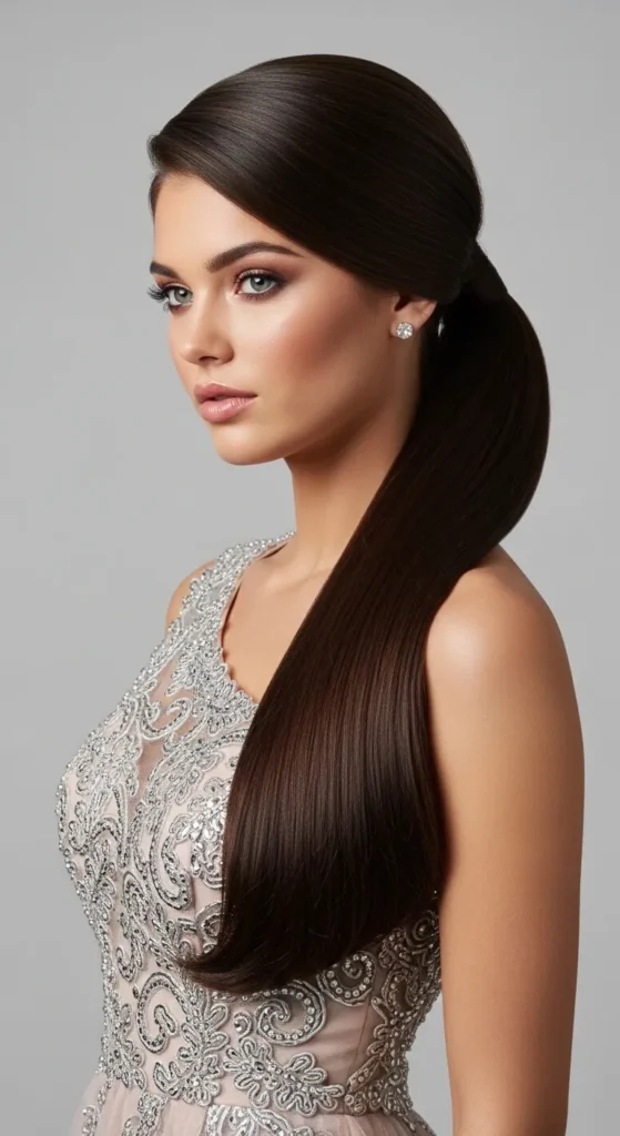 A side pony adds instant elegance and works beautifully with asymmetrical dresses. Keep it smooth for a sophisticated finish.