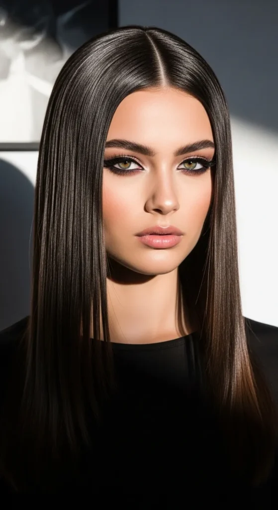 Sometimes simple is powerful. Super-straight, shiny hair with a clean middle part looks modern and fashion-forward, especially with dramatic eye makeup.