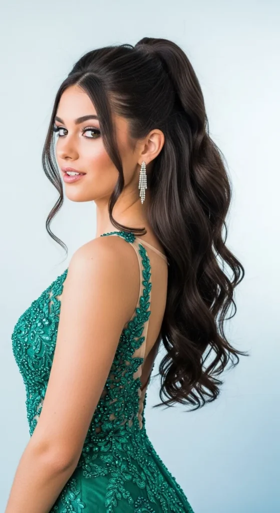 This modern twist blends a ponytail with soft curls. It’s youthful, flattering, and perfect if you want something trendy but still formal enough for prom.