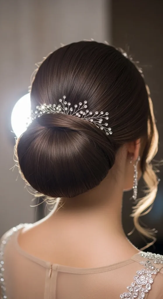 Add a delicate clip or comb to a simple low bun for instant glam. This is a great option if your dress is minimal.