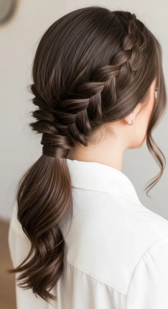 Two soft braids feeding into a ponytail feel modern and chic. This style is perfect if you want something unique without being too bold.