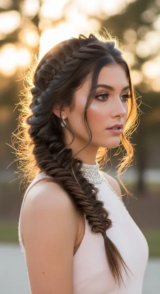 Fishtail braids look intricate but can feel relaxed when pulled slightly loose. This style works well for long hair and gives a trendy yet timeless prom vibe.