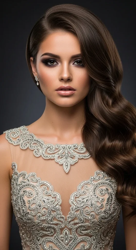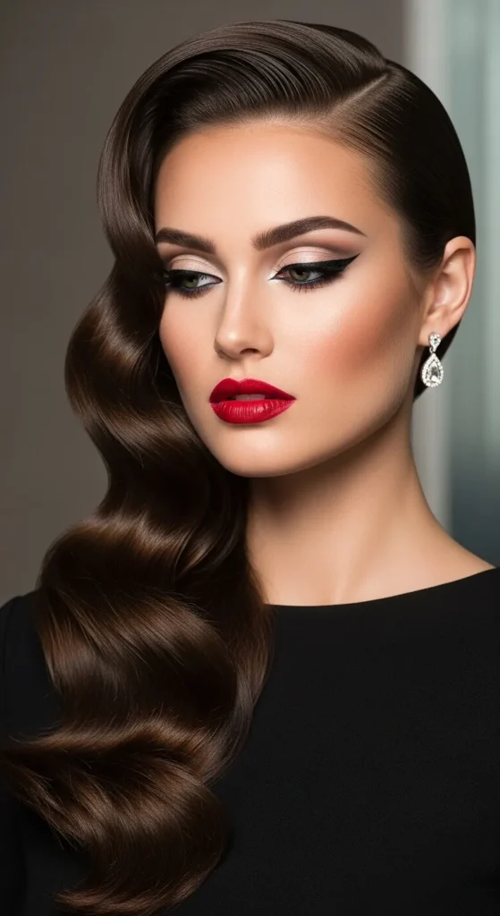 Deep, polished waves create instant red-carpet drama. This style looks stunning on brunette hair and pairs best with sleek dresses and bold makeup.