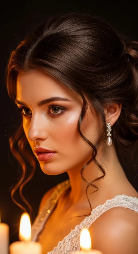 A curly updo with soft tendrils feels effortless and romantic. This style works especially well for brunettes because curls reflect light beautifully. Pair it with delicate earrings for a dreamy prom look.