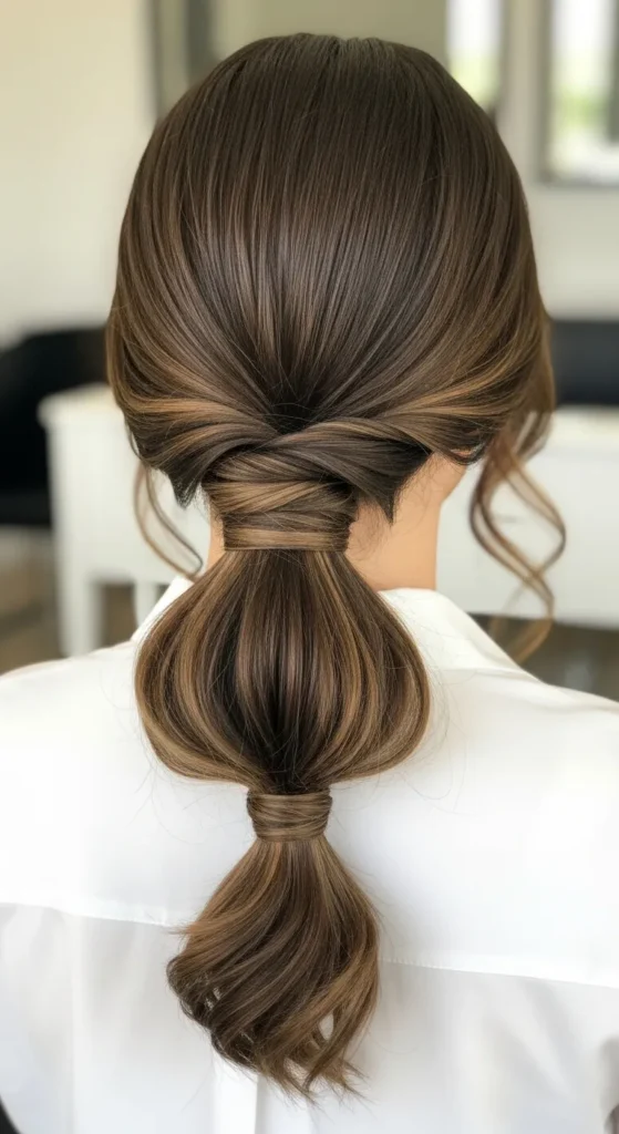 A low ponytail wrapped with a strand of hair feels sleek and elegant. It’s comfortable, chic, and perfect if you want something different from curls.