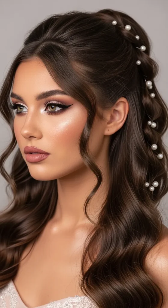 Add subtle pearl or crystal pins to elevate a simple half-up style. This look feels soft, feminine, and perfect for elegant prom themes without looking overdone.