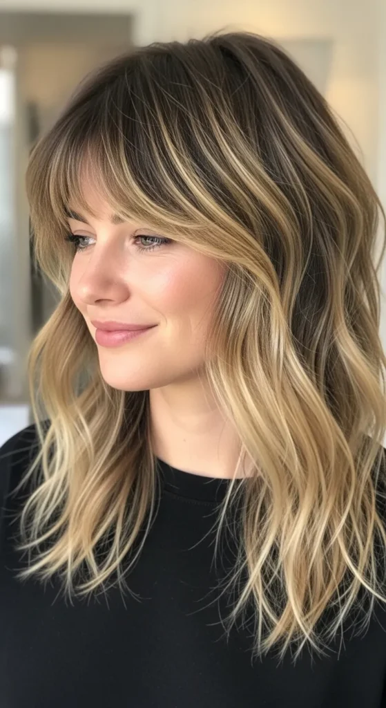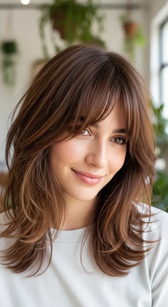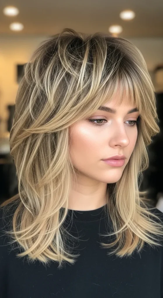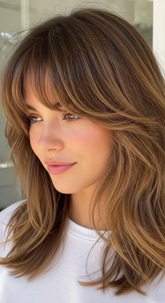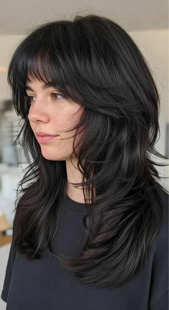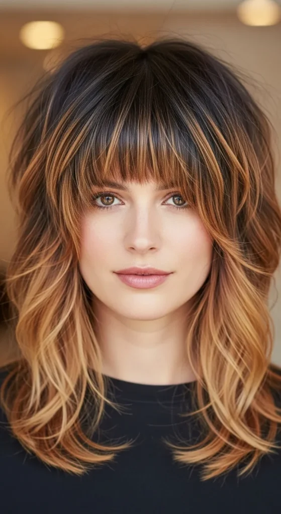 This bold combo creates contrast—soft layers with a sharp fringe. It’s edgy, modern, and eye-catching.